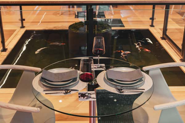 Enter through a private wooden walkway suspended above the garden to this suite. The bedroom features a four poster king bed and spacious sitting area with high ceilings and a fireplace. The spa-like bathroom has a wood soaking tub, river rock tile shower, and double vanities. Panoramic mountain views await in the reading nook, perfect for unwinding with a book and a glass of wine.